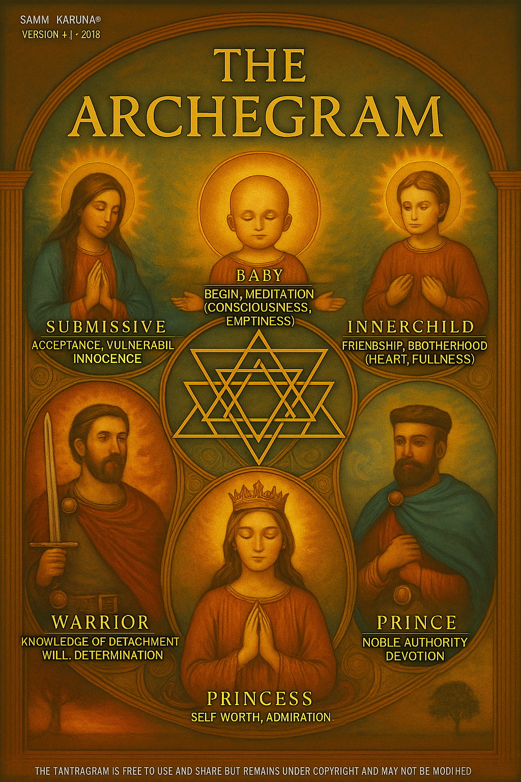 Unconditional love, wholeness, and the interconnectedness of all phenomena. This phase is characterized by transpersonal and unconditional love, reflecting a deep sense of connection with oneself, others, and the entire world. It represents the transcendence of the ego and the realization of a fundamental unity with all that exists. This archetype highlights the essence of embracing a state of pure heart, free from attachment and conceptualization, allowing for a profound sense of happiness and clarity.